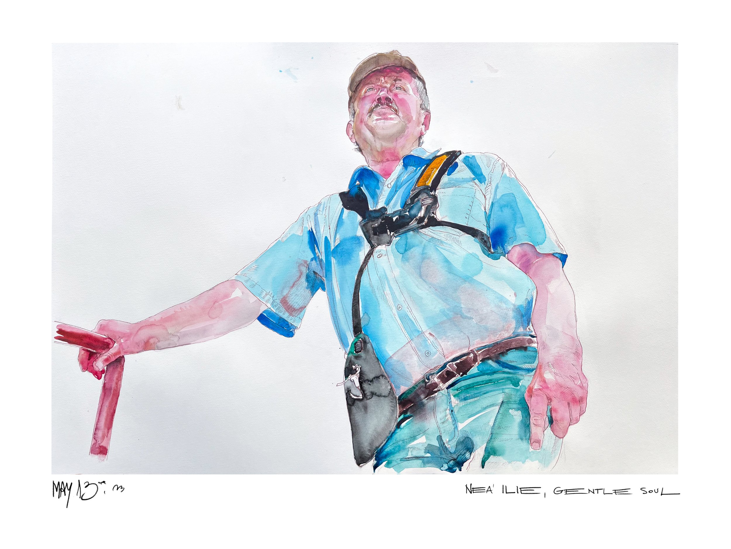 I joined him for two runs last weekend, and he took me through the woods, howling every once in a while, to keep the bears at bay. Mircea is 48, runs fast, has an athlete’s gait, has no problems with his knees (thanks for asking), and he says running has made him more aware of the world: how saplings wrestle for space when a mature tree dies, how bear tracks look in the mud, what people are up when he passes them by. He actually often takes photos while running, which he then turns into large sized watercolors. (Like the one below).