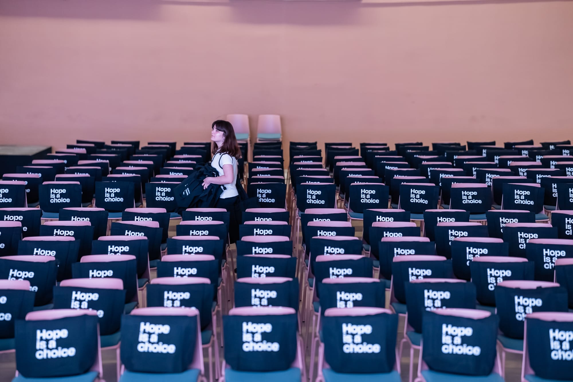 The room was packed – we counted 543 seats in the morning, all carrying a black tote bag with Hope is a Choice printed on it. It was time. The lights went down, and the room-length screen switched to read The Power of Storytelling in white, on a dark gray background. As the chatter quieted, Maria (who performs as Krrysopher) and Daria walked on stage, took their seats, hands on the keyboard, fingers on the strings. The first notes, notes that would echo through the weekend, began.