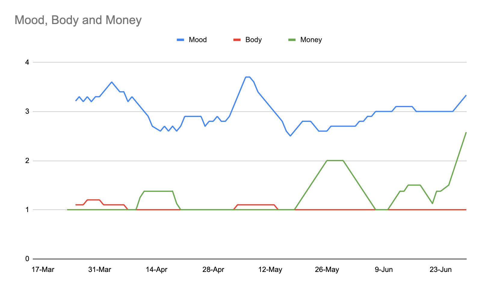 For fun (or for an end-of-the-year review session) I also started in mid-March to do a daily grading of three indicators: mood, body (how I feel about it), and finances (how confident and stable I feel). The data isn’t great – but it proves self-sabotage – especially when it comes to the latter two. Anyway, mood averages 3+ out of 5, but both body and finances average less than 1.5. As you can see in the graph below, it’s only in the past two weeks that confidence in my financial situation has increased.